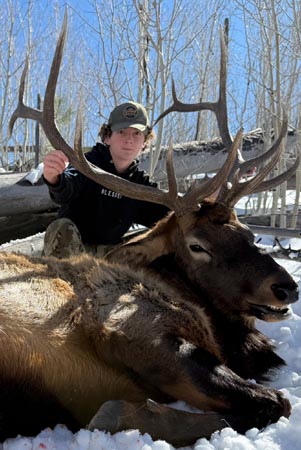 Muzzleloader hunter with his first Bull Elk. Taken with a muzzleloader at 250 yards. 56" main beams
